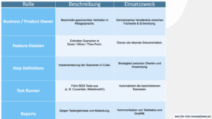 Bei BDD werden Testfälle in einer menschenlesbaren Sprache wie Gherkin geschrieben. Tools wie Cucumber verbinden diese Szenarien dann mit automatisierten Tests, z. B. in WebdriverIO oder Playwright.