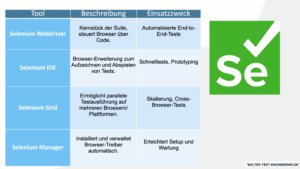 Selenium ist kein vollständiges Testtool, sondern ein Automatisierungsframework. In Projekten zeigt sich schnell, dass Testlogik, Assertions, Reporting und Testmanagement über zusätzliche Tools oder Frameworks ergänzt werden müssen.